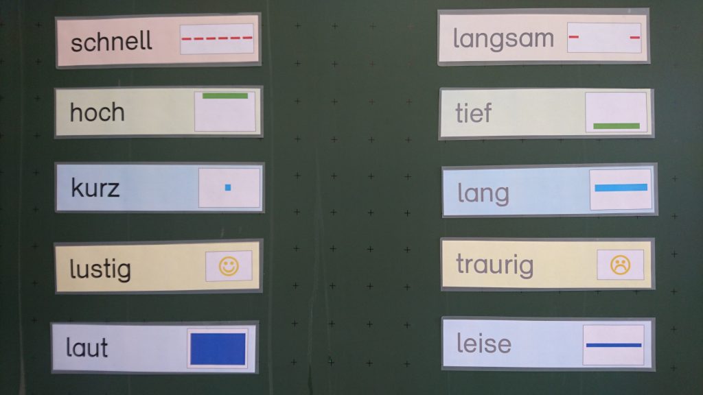 Mit Wortspeichern kann man in allen Unterrichtsfächern arbeiten, hier z.B. zu Musik, Werkhören „Peter und der Wolf“ eine Wortschatzsammlung zu den Klangfarben, organisiert nach Gegensätzen (semantische Relation): Die Adjektive und deren schematische Visualisierungen helfen, um Musik beim Werkhören genauer zu beschreiben.