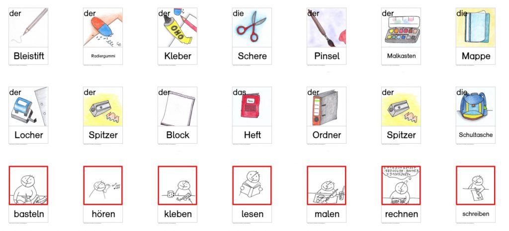 Kennt Ihr das auch? Zu Schuljahresbeginn werden Klassen neu gebildet oder zusammengesetzt. Oft sind auch viele mehrsprachige Kinder dabei oder Kinder, die über einen eingeschränkten Wortschatz verfügen. Oder man hat einfach aufgrund von Gewohnheiten andere Begrifflichkeiten, z.B. „Schultasche“ oder „Schulranzen“. Da macht es Sinn, die wichtigen Schulmaterialien zu visualisieren, um eine gemeinsame Sprache zu finden. Das geht super mit dem Konzept „Wortspeicher“.